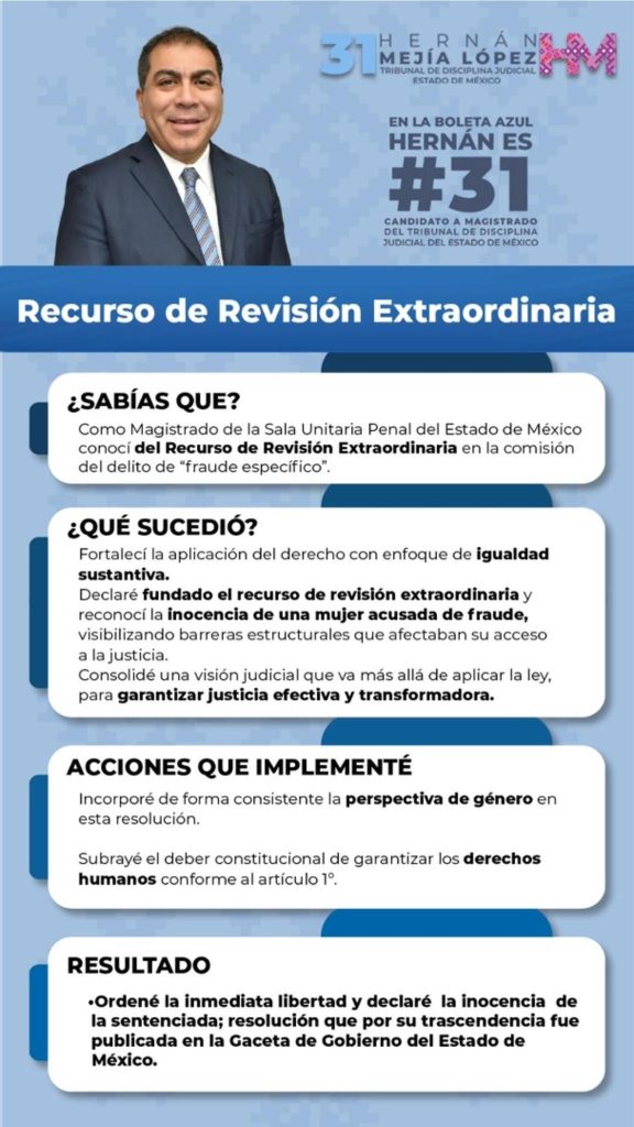 En video que circula en sus redes sociales, Maestro Edgar Hernán Mejía López refiere: soy Magistrado del Tribunal Estado de México, y soy el único magistrado que ha juzgado en todas las materias: Familiar, Civil, Mercantil, Penal, Constitucional y Asuntos Indígenas y Afro-Descendientes; el poder judicial del Estado de México se divide en cuatro regiones judiciales, su Administración y su Juzgamiento. Su servidor ha estado juzgando y resolviendo asuntos, repito de todas las materias en la zona de Toluca, Ecatepec y Tlalnepantla, eso significa que conozco la forma de litigar de postular, y sobre todo las necesidades de la sociedad, de la población, y de un Poder Judicial cercano a ellos”, dice en los videos.