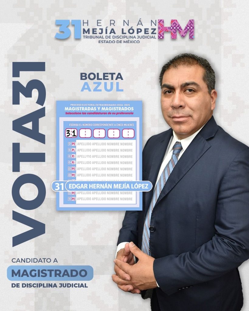 El Maestro Edgar Hernán Mejía López, candidato a Magistrado del Tribunal de Disciplina Judicial del Estado de México, da a conocer a través de redes sociales sobre su camino en el Poder Judicial, y el objetivo que busca combatir la corrupción, el tráfico de influencias y de interés dentro del nuevo Poder Judicial.