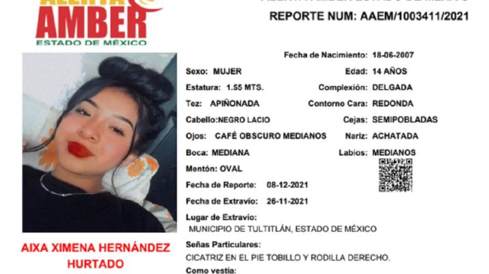 General Policíaca 10/12/202110/12/2021 ACTIVAN ALERTA AMBER POR AIXA XIMENA HERNÁNDEZ HURTADO Publicado por: Redaccion 0 comentarios TOLUCA, Méx.- Se ha activado la Alerta Amber México por Aixa Ximena Hernández Hurtado, de 14 años de edad, quien fue reportada como no localizada en el municipio de Tultitlán. Locatel CDMX (0155) 56 58 11 11 Locatel Edomex (01722) 214 24 25