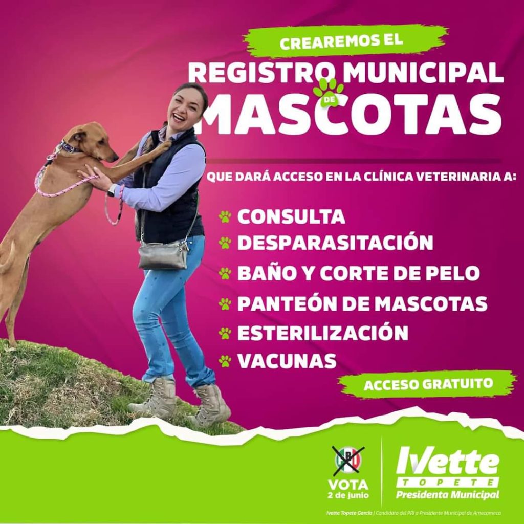 Finamente y con un proyecto no menos importante, la candidata tricolor posteó en sus redes sociales un mensaje donde indica la importancia del bienestar de los animalitos de compañía, ya que estos animales de casa, también son una prioridad que su gobierno atenderá en caso de que el voto le favorezca; y el texto dice: “Porque el bienestar animal es una prioridad, crearemos el registro municipal de mascotas donde habrá: consultas, desparasitaciones, esterilizaciones, vacunas y más; este 2 de junio te invito a VOTAR por el proyecto que realmente se preocupa y ocupa por los animalitos”, finalizó. (Fotos RSCSAyF)