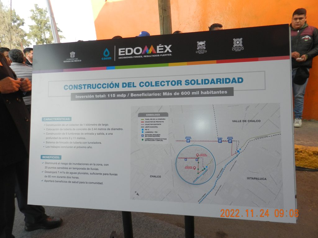 Cabe señalar que la Construcción del Colector Solidaridad durará aproximadamente 6 meses y será en beneficio de más de 150 mil personas, en 22 comunidades del municipio de Chalco y otras 450 mil de Valle de Chalco, Ixtapaluca y otros municipios de la Región de los Volcanes.
