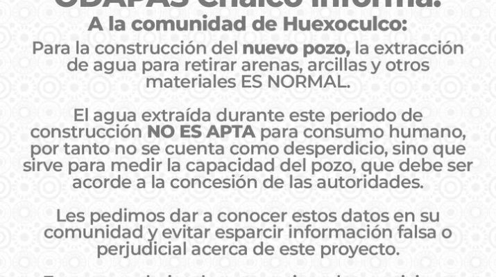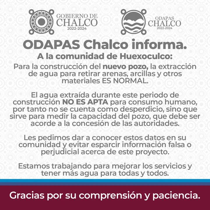 El gobierno de Chalco a través de sus redes sociales informó que el agua extraída del pozo en la delegación Santa Maria Huexoculco, aún no es apta para consumo humano, ya que durante el proceso de excavación de este pozo el agua que se extrae aún no está considerada como útil para consumir.