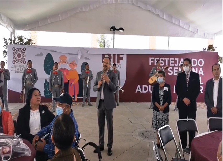 El Presidente Municipal, Miguel Gutiérrez encabezó la primera reunión con las y los adultos mayores de los clubes de la tercera edad, para celebrar el Mes del Adulto Mayor, con música de mariachi y la Banda Municipal, la entrega de chalecos y una convivencia en el Ágora Chalco.