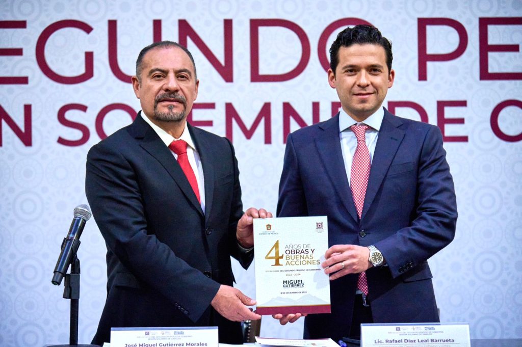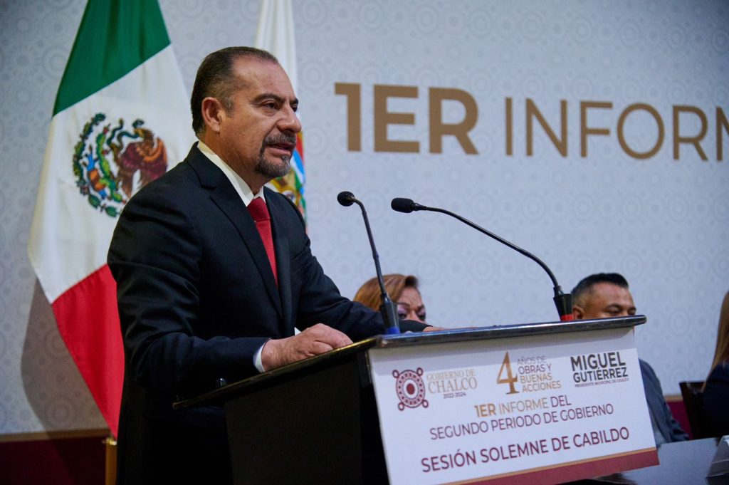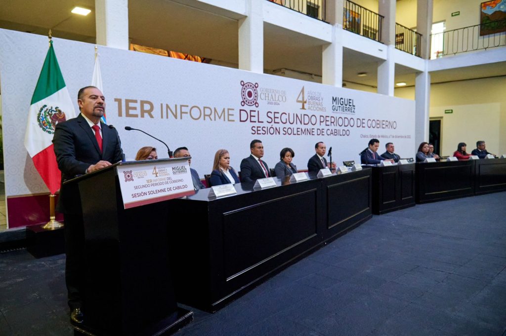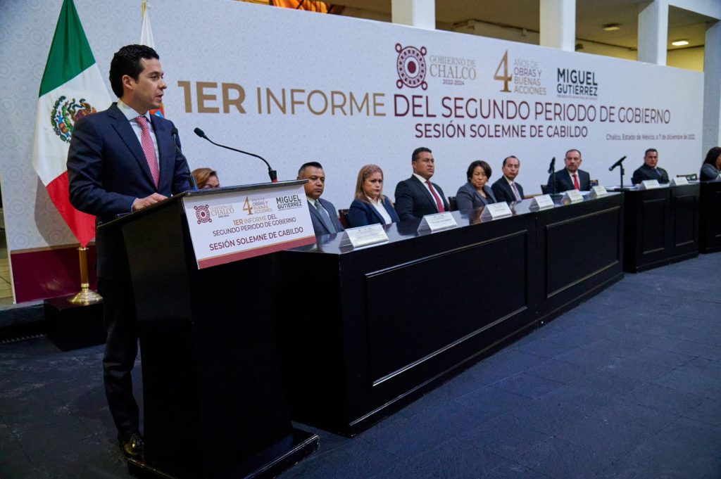 En Sesión Solemne de Cabildo, y ante el Secretario de Desarrollo Urbano y Obra de Gobierno del Estado de México y representante personal del Gobernador Alfredo de Mazo, Rafael Díaz-Leal Barrueta; el Secretario del Ayuntamiento; la Síndica; las y los Regidores, El Presidente Municipal, Miguel Gutiérrez, presentó el Primer Informe del estado que guarda la Administración Pública 2022-2024.