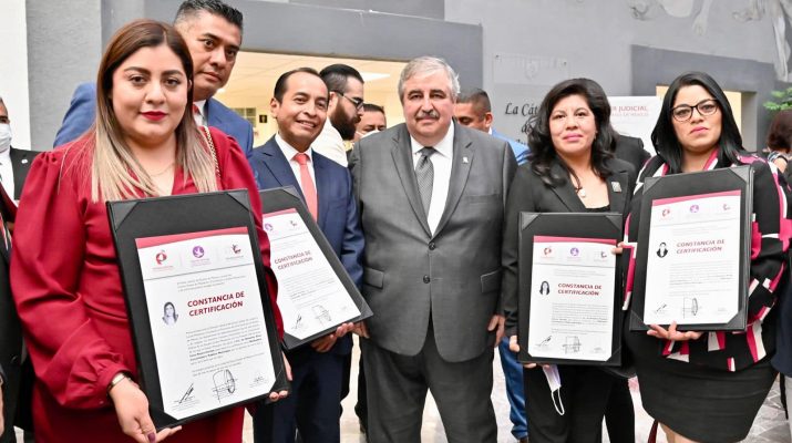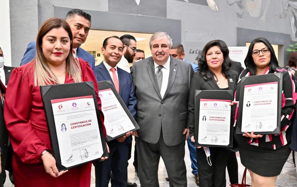 En la Escuela Judicial del Estado de México, los oficiales calificadores de los tres turnos de este municipio, junto con la titular de esta oficina, recibieron de manos del Magistrado Presidente del Poder Judicial del Estado de México, Ricardo Sodi Cuéllar el Certificado que acredita su actualización por cinco años en el tema de mediación, conciliación y justicia restaurativa.