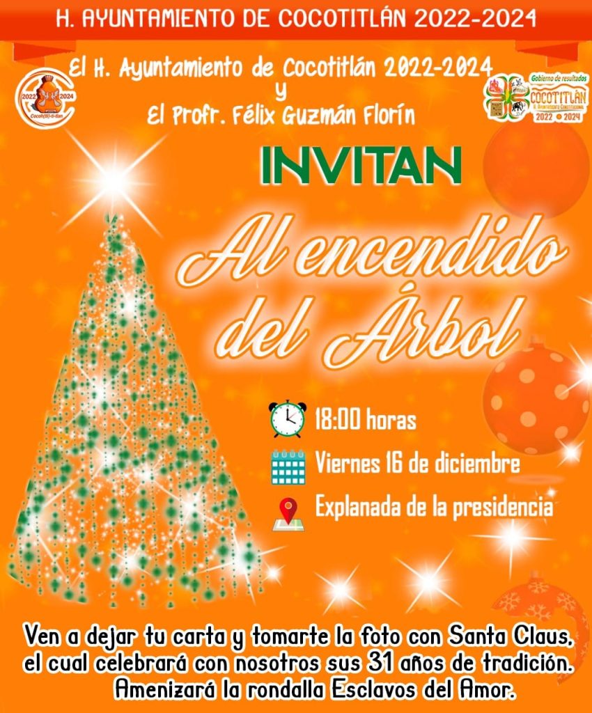 Para conservar las tradiciones navideñas, fortalecer la convivencia familiar en esta temporada de fiestas navideñas, el alcalde Félix Guzmán Florín, junto con la Presidenta Honoraria del Sistema Municipal para el Desarrollo Integral de la Familia (DIF), ) Virginia Velazco Peñaloza, e integrantes del cabildo 2022-2024, invitaron a la ciudadanía en general, al encendido del monumental árbol de navidad que estará en la explanada municipal.