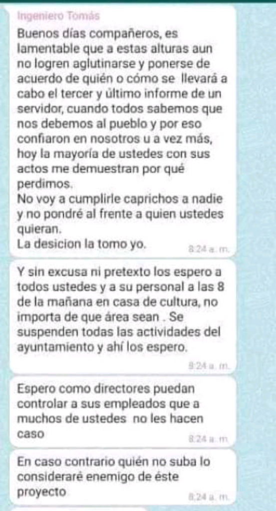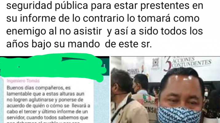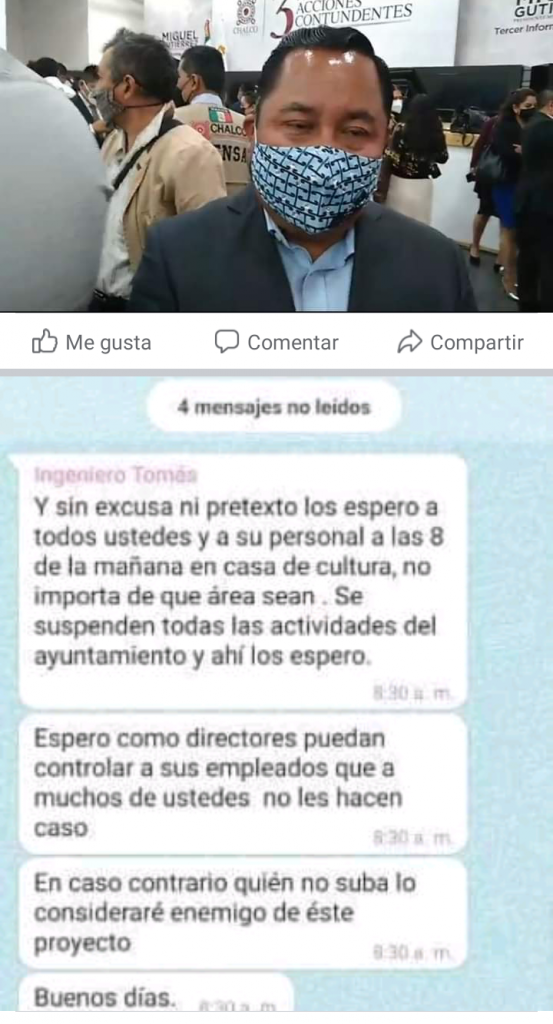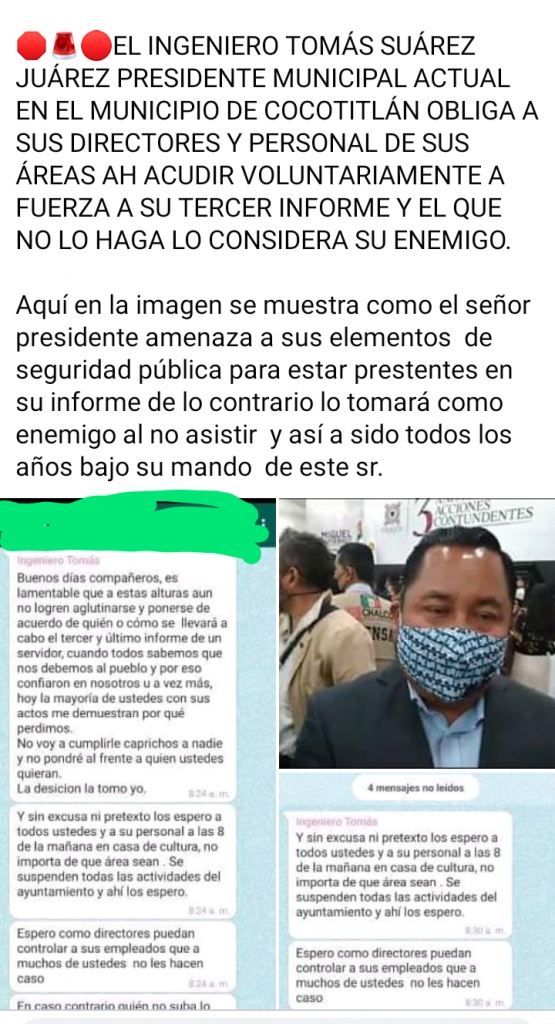 En redes sociales circulan acusaciones delicadas y severas en contra del presidente municipal de Cocotitlán Tomás Suárez Juárez, a quién a través de una cuenta de Facebook publican captura de pantalla de mensajes que posiblemente haya enviado el alcalde, en un supuesto grupo de WhatsApp de sus colaboradores.