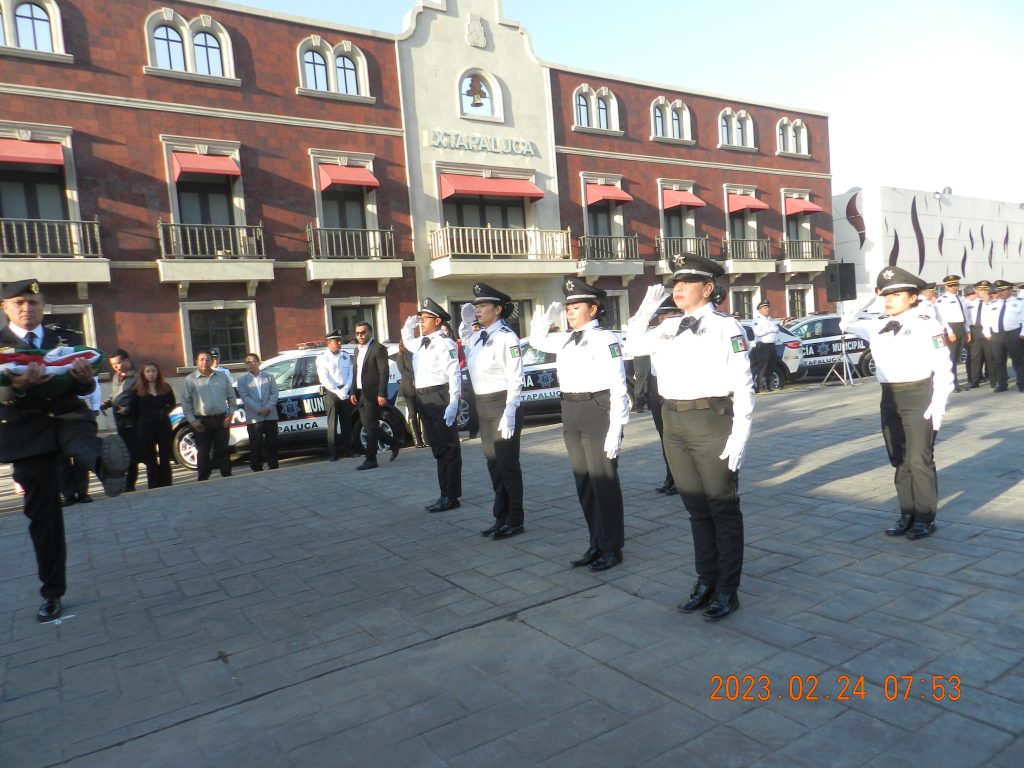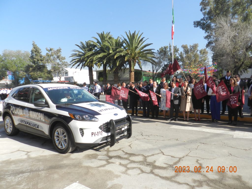 Momentos después, la escolta de la dirección de Seguridad Pública y Tránsito Municipal de Ixtapaluca, recibieron el nuevo Lábaro Patrio, se le rindieron los honores correspondientes y fue izada a toda asta, la nueva monumental Bandera Nacional Mexicana.