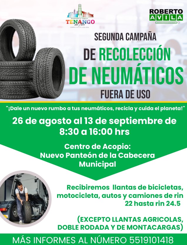 La campaña será del 26 de Agosto al 13 de Septiembre, en un horario de 08:30 a 16:00 horas; y las llantas que la ciudadanía entregue, serán recibidas en el centro de acopio en el nuevo panteón de Cabecera Municipal, y con ello contribuir para un mejor ecosistema, por eso, se invita a las y los habitantes a participar activamente depositando los neumáticos que ya no utilizan, ya que esta acción forma parte de los esfuerzos municipales por promover un entorno más limpio y saludable, además de contribuir a la concientización sobre la correcta disposición de este tipo de residuos.