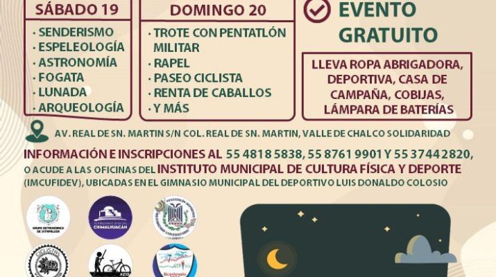 Habrá momento de observación celeste, encendido de fogatas, organización de rapel, paseo a trote dirigido por el Pentatlón Deportivo Militarizado Universitario, así como renta de caballos y paseo ciclista; por eso, asiste en familia y amigos y disfruta de las maravillas naturales, cultura e historia que te ofrece Valle de Chalco, a través de estas medidas orientadas a estimular la economía, promover y desarrollar el amplio potencial turístico del municipio.