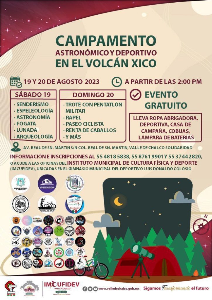 El gobierno municipal que titulariza el alcalde Armando García Méndez, en coordinación con el Instituto Municipal de Cultura Física y Deporte (IMCUFIDE), invitan al primer campamento astronómico y deportivo en el volcán Xico, totalmente gratuito que se realizará del 19 al 20 de agosto 2023, en el interior del ombligo del mundo, un volcán extinto en actividad, pero que es el símbolo de este municipio, y orgullo del arraigo de los habitantes.