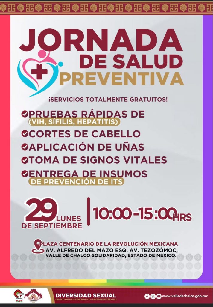El alcalde Alan Velazco junto con su cuerpo edilicio y la Dirección de Atención a la Diversidad Sexual invita. a las y los habitantes de Valle de Chalco a acudir a esta Jornada de Salud Preventiva y aprovechar los servicios gratuitos, subrayando que la prevención es la mejor herramienta para proteger la salud y mejorar la calidad de vida.