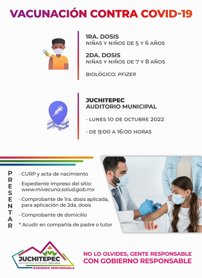 El gobierno municipal, que preside la alcaldesa Marisol Nava Linares, en coordinación con el Instituto de salud del Gobierno del Estado de México (ISEM), y el Gobierno Federal, estarán aplicando vacunas gratuitas contra Covid-19 a las y los niños de este municipio y delegación San Matías Cuijingo, en un rango de edad de 5 y 6 años de edad, para suministrar su primera dosis, y a los de 7 y 8, recibirán su segunda dosis del antígeno, en el Auditorio Municipal, en día lunes 10 de octubre 2022 de 09:00 a 16:00 horas.